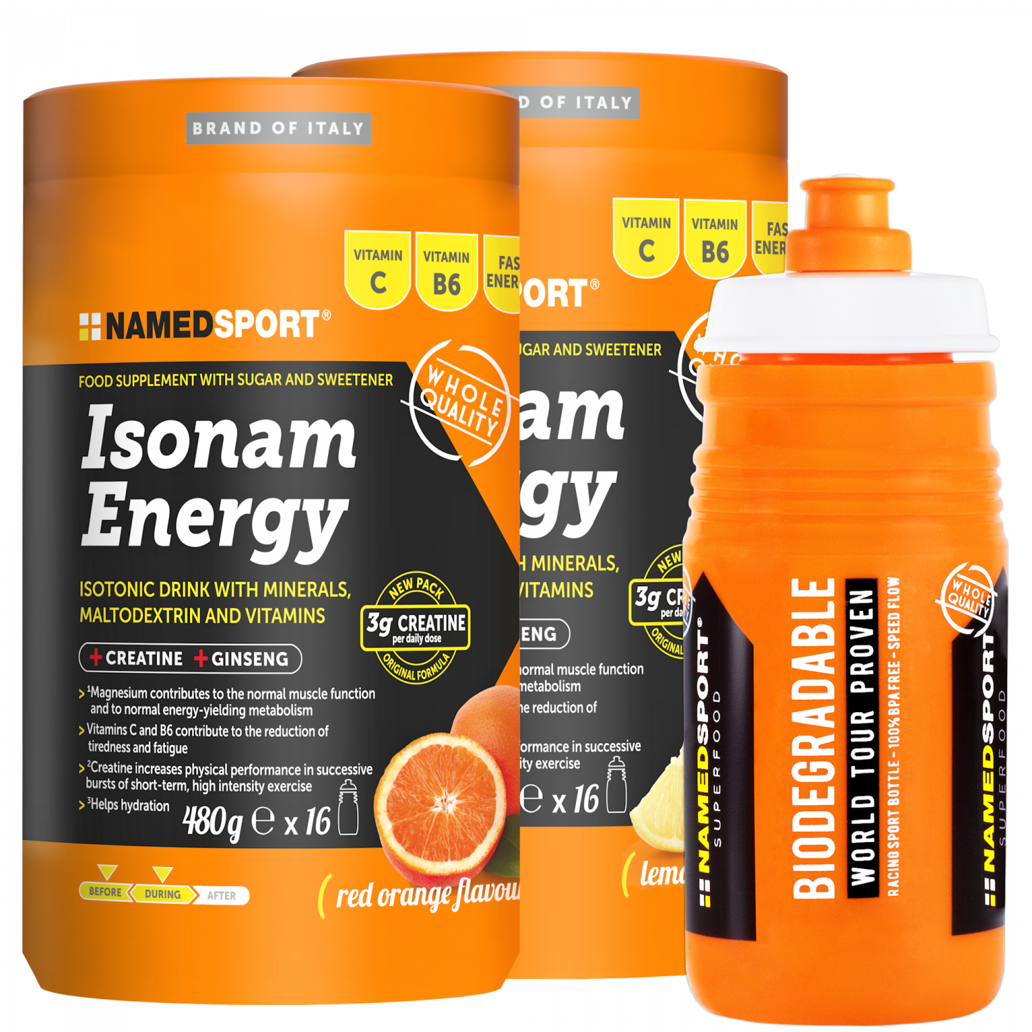 Das Namedsport Isonam Aktionspaket enthält 2 x Dosen á 480 g plus eine Trinkflasche. Das erfrischendes Sportgetränk basiert auf einfachen und komplexen Kohlenhydraten. Neben Natrium, Chlorid und Magnesium liefert das Getränk Vitamine, Kreatin und Ginseng-Extrakt.